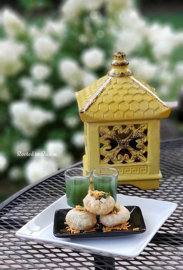 The original calls for the stuffed pooris to be dunked in a bowl of spiced water and eaten.