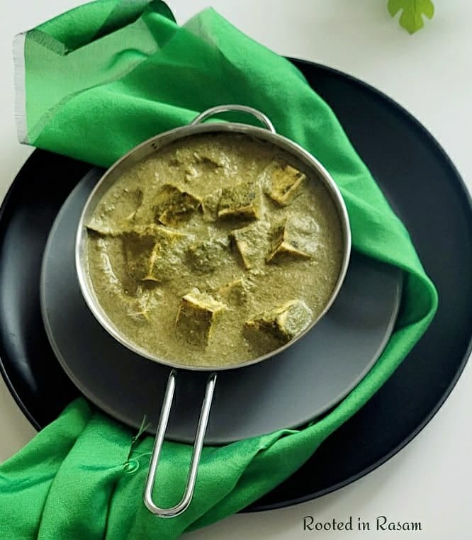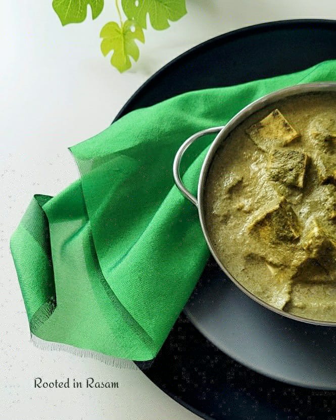 Palak Paneer – Paneer, the most popular Indian cheese cooked in a spiced spinach puree. Serve hot with rice or rotis. As is, makes a great soup – rich in Iron and protein ! A favorite from my childhood ♥️