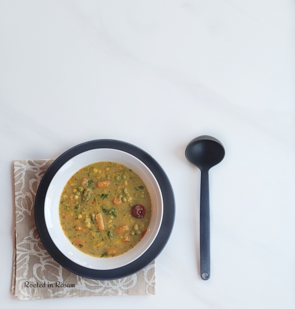 A Mixed Vegetable Kootu is always on the menu the day I’m cleaning put the refrigerator before a trip to the grocery.