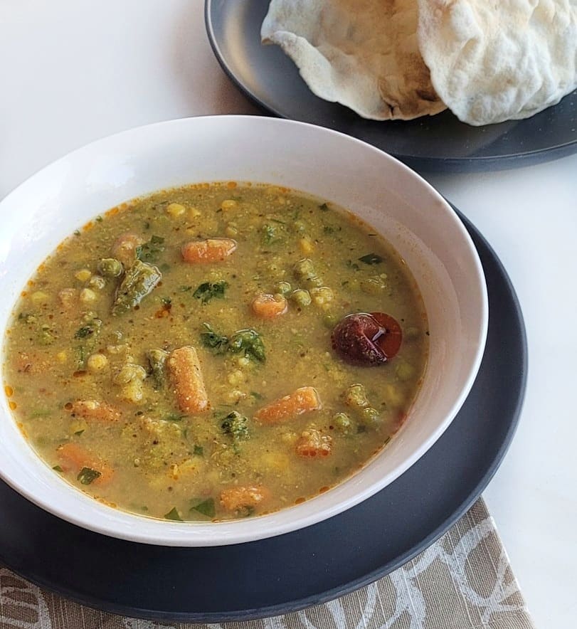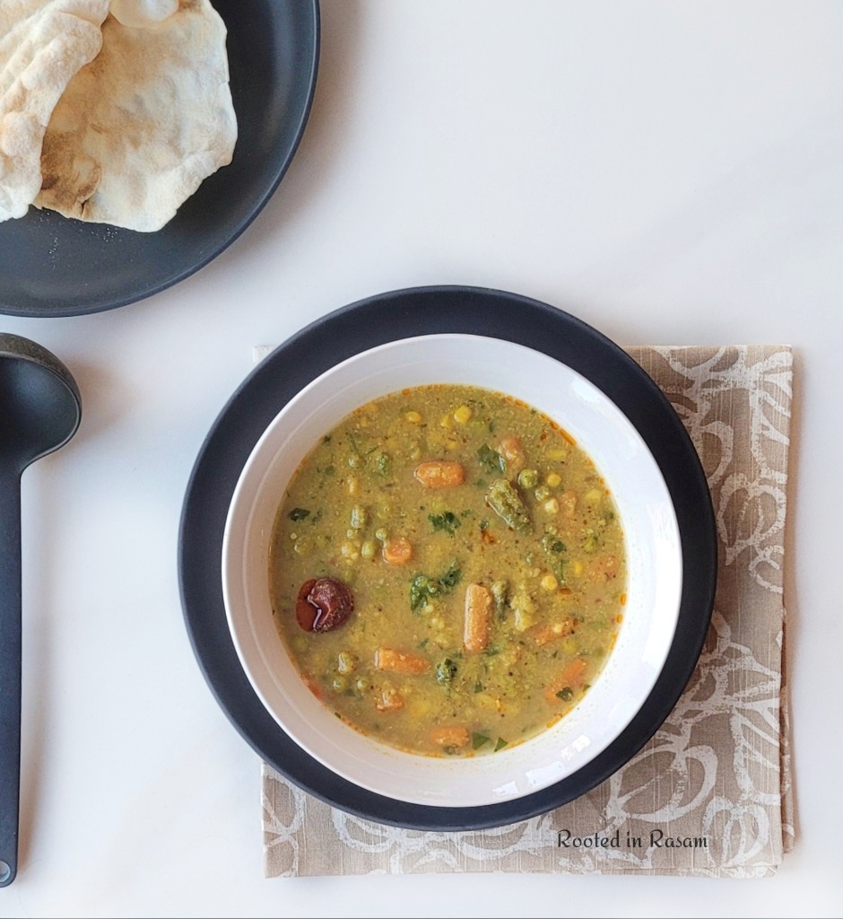 A delicious lentil and vegetable stew, flavored with coconut and spices. Delicious as a soup for the carb conscious, or can be eaten with rice. Add an Apalam ( lentil or rice crisp) on the side for crunch !