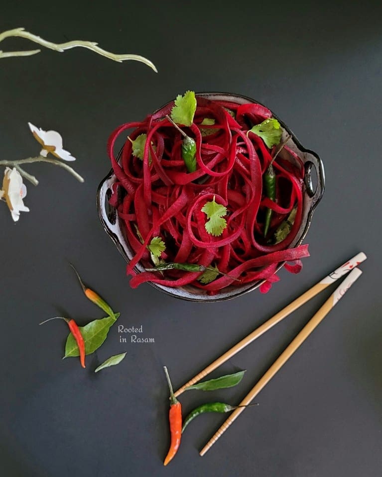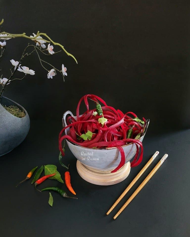 For today, for a change, I let my vegetable peeler (if you remember a previous beet post 😆) go on and on and converted it to a spiraling device, and came up with what looked like Beet Udon noodles. I flash cooked it and served it as a salad, still deep pink, still crunchy and delicious with Thai chillis for an extra zing !