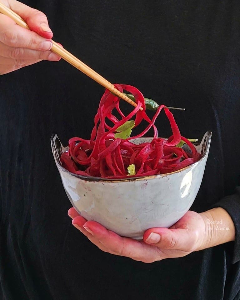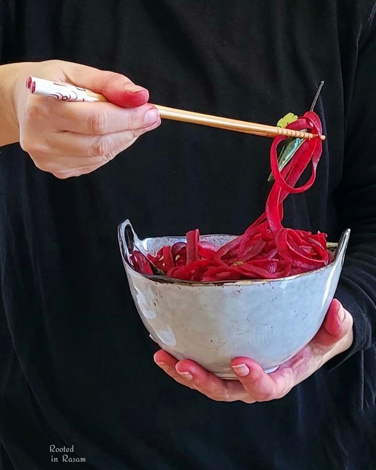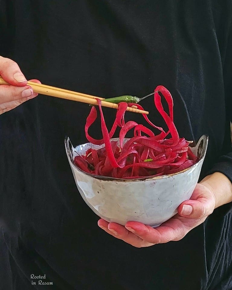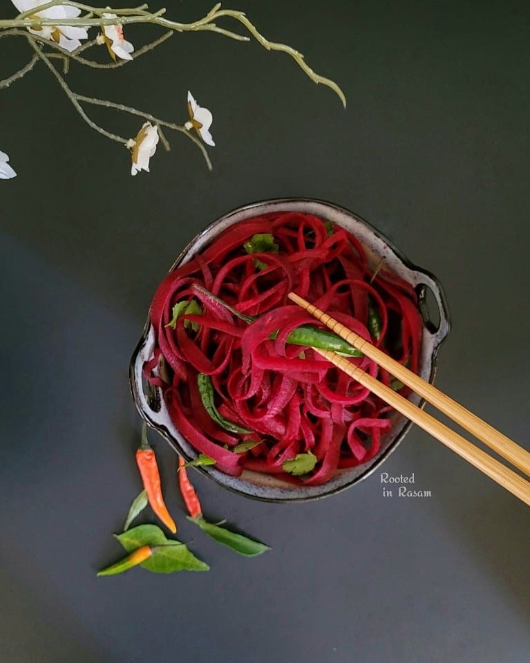 Perhaps there is some connection to my love for Marudhani ( Henna/Mehandi,) that I let my beet stained hands be, on days I cook it. Remember that I loved it so much that my mom planted a Marudhani tree in the backyard, and often I would grind it an make little caps of the paste for my fingertips and little dots for my palms. But let me not deviate here, that’s a story for another day…