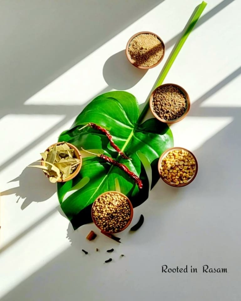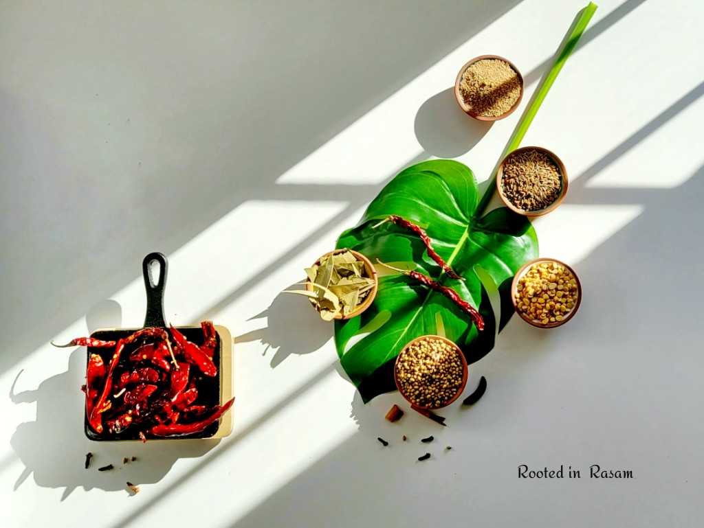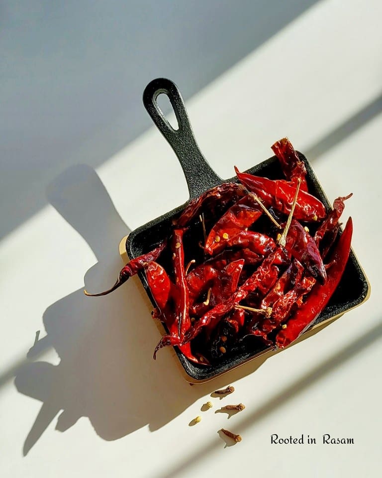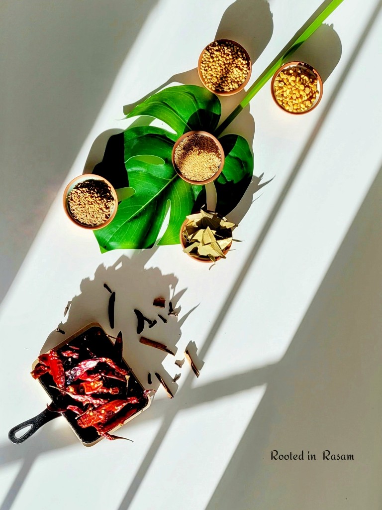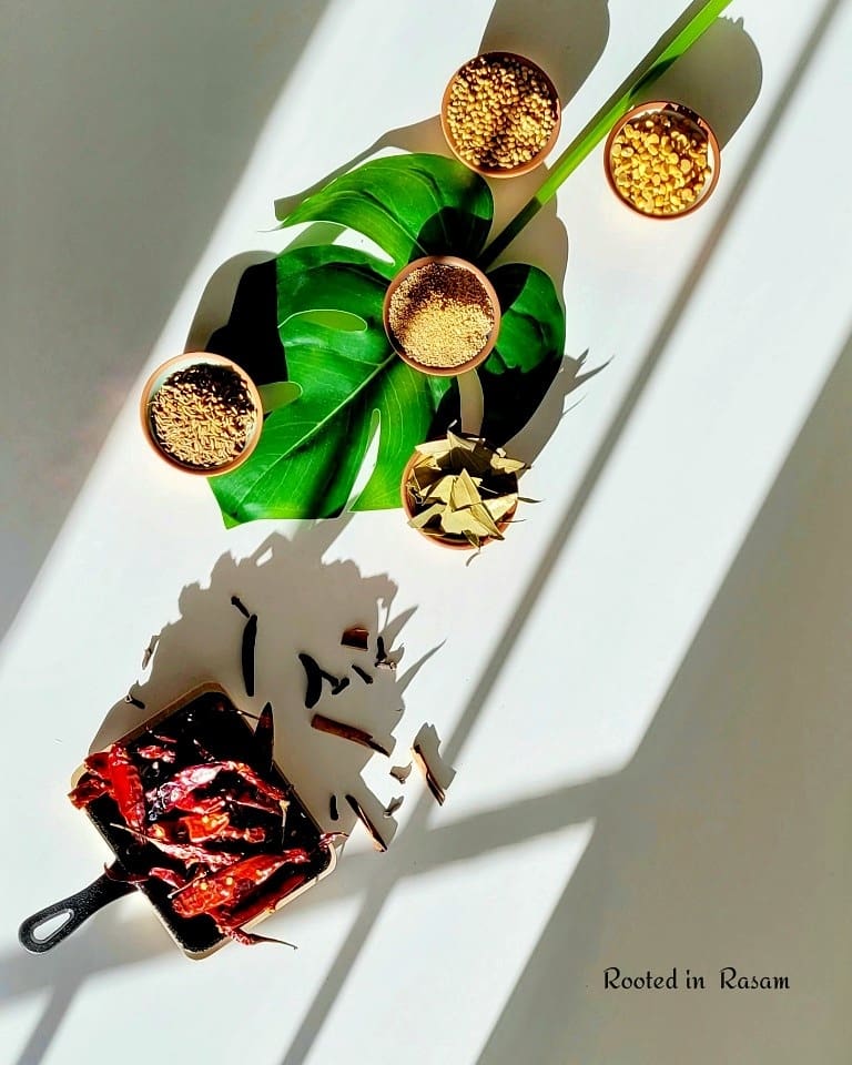 In the super hot Chennai sun, especially in the peak summer months of Agni Nakshatram, very often the dry roasting can be avoided – fuel energy saving as the solar power takes on. In lieu of dry roasting, spices can be placed in the sun and tossed a few timesto ensure they are super dry, before they are powdered.
