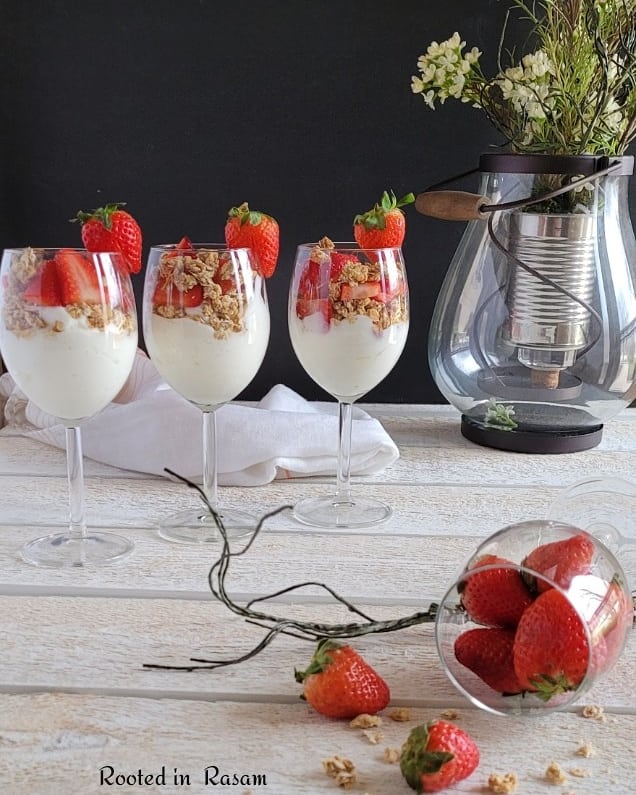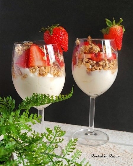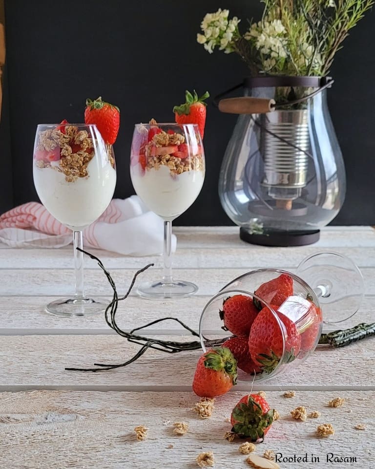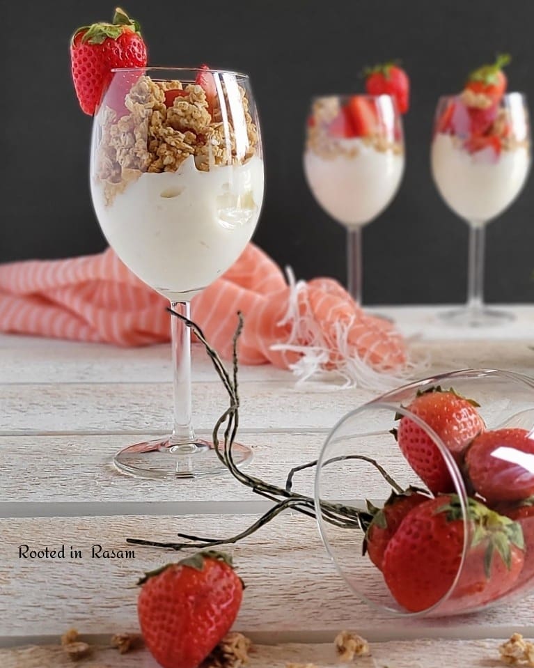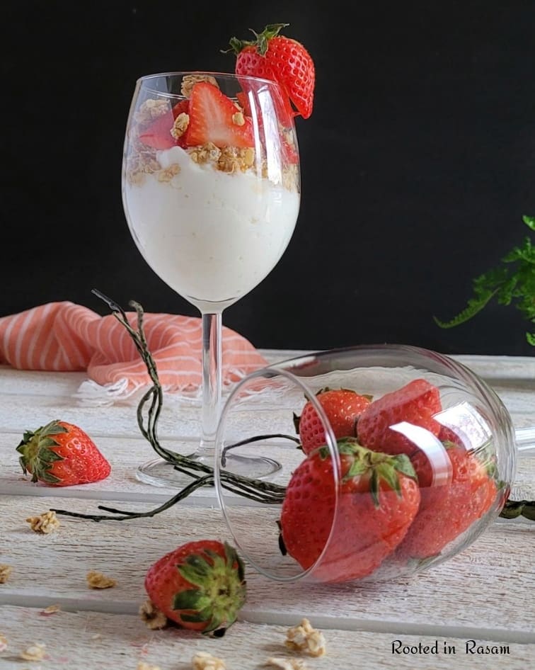 A breakfast so simple for my daughter, that I decided to glam it up with some fancy plating. Who said wine glasses need to be used for wine alone ?