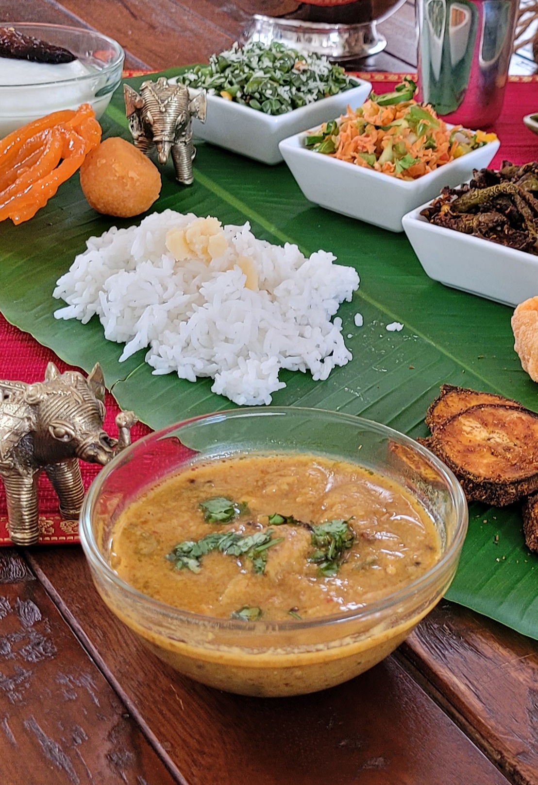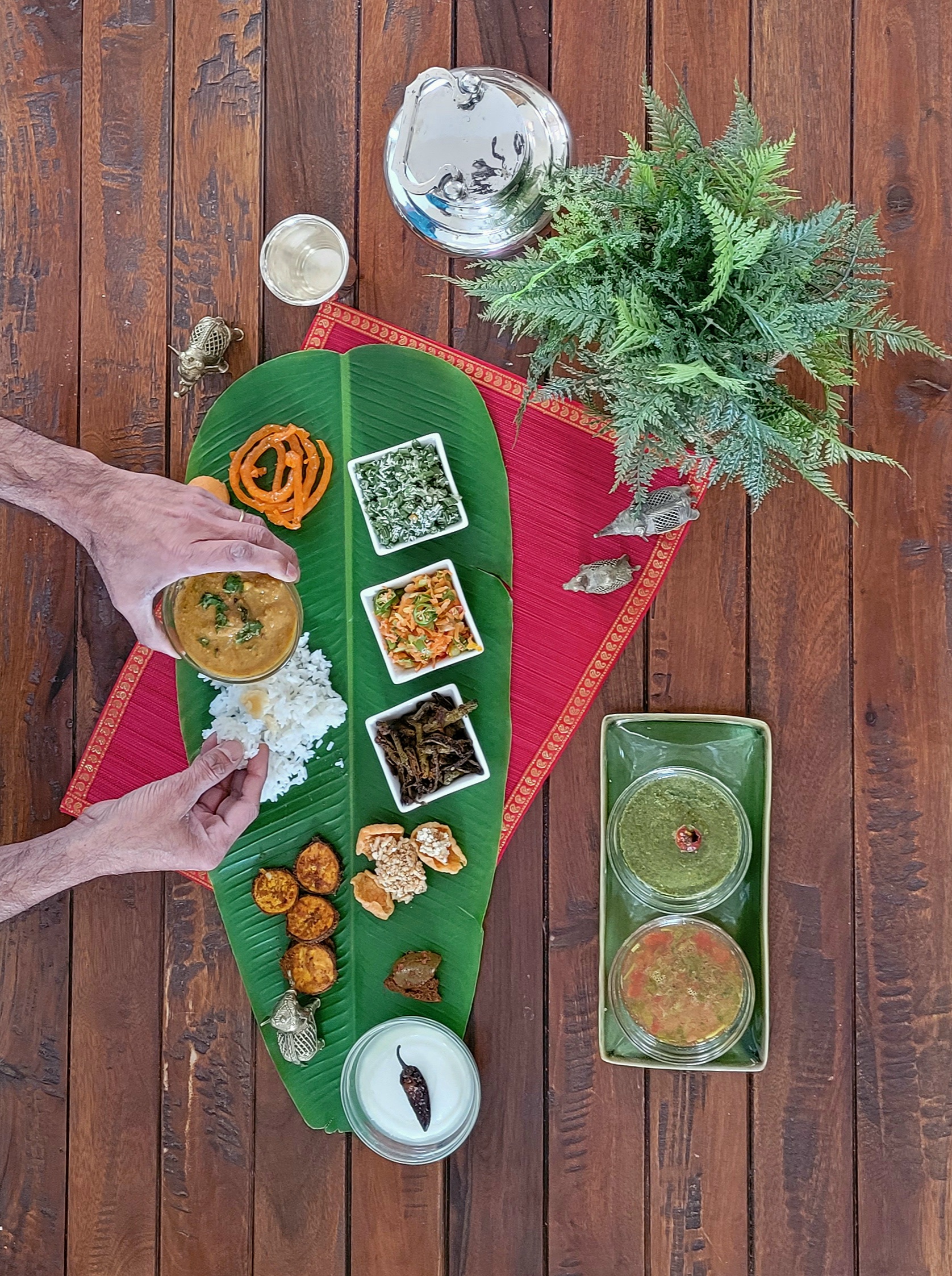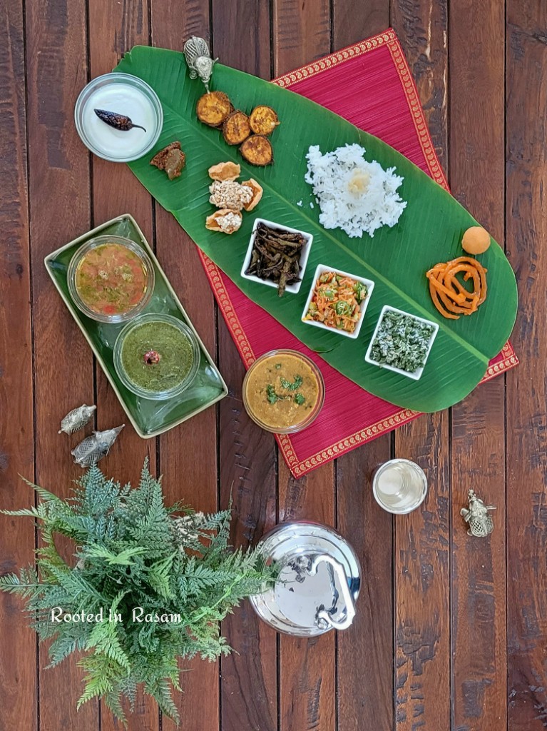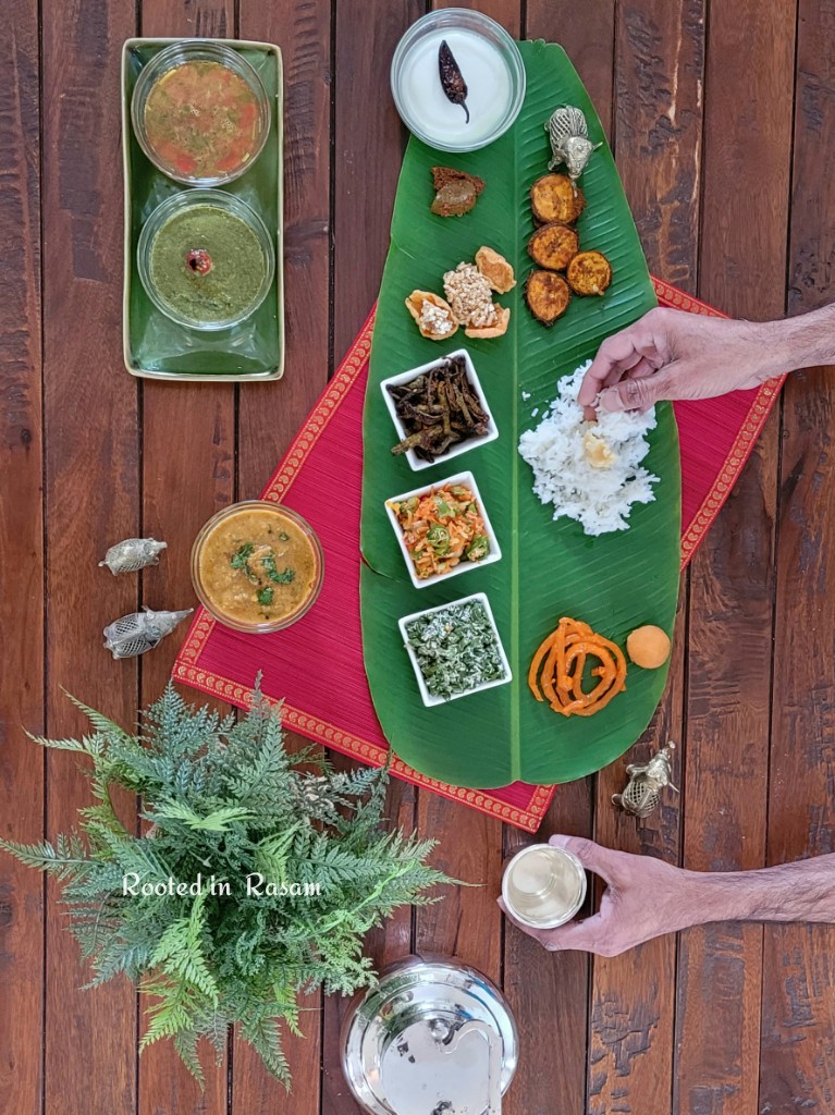 P.S. If you discount the cups on my frame, and serve it as done normally, right on the banana leaf, it is the perfect example of an eco friendly bio degradable vegetarian meal. Once the meal is done, the leaves were fed to the cows. If the cows will ever eat leaves without flavors again is another quesion😆…