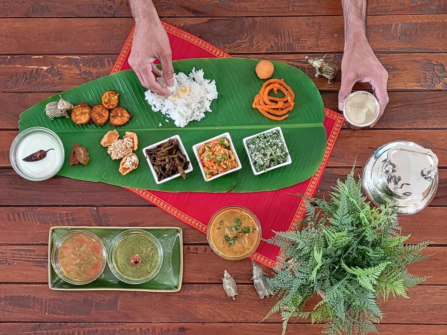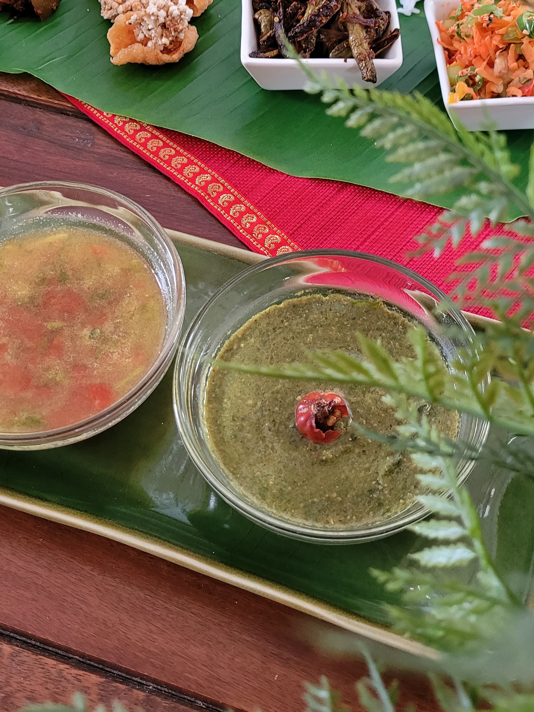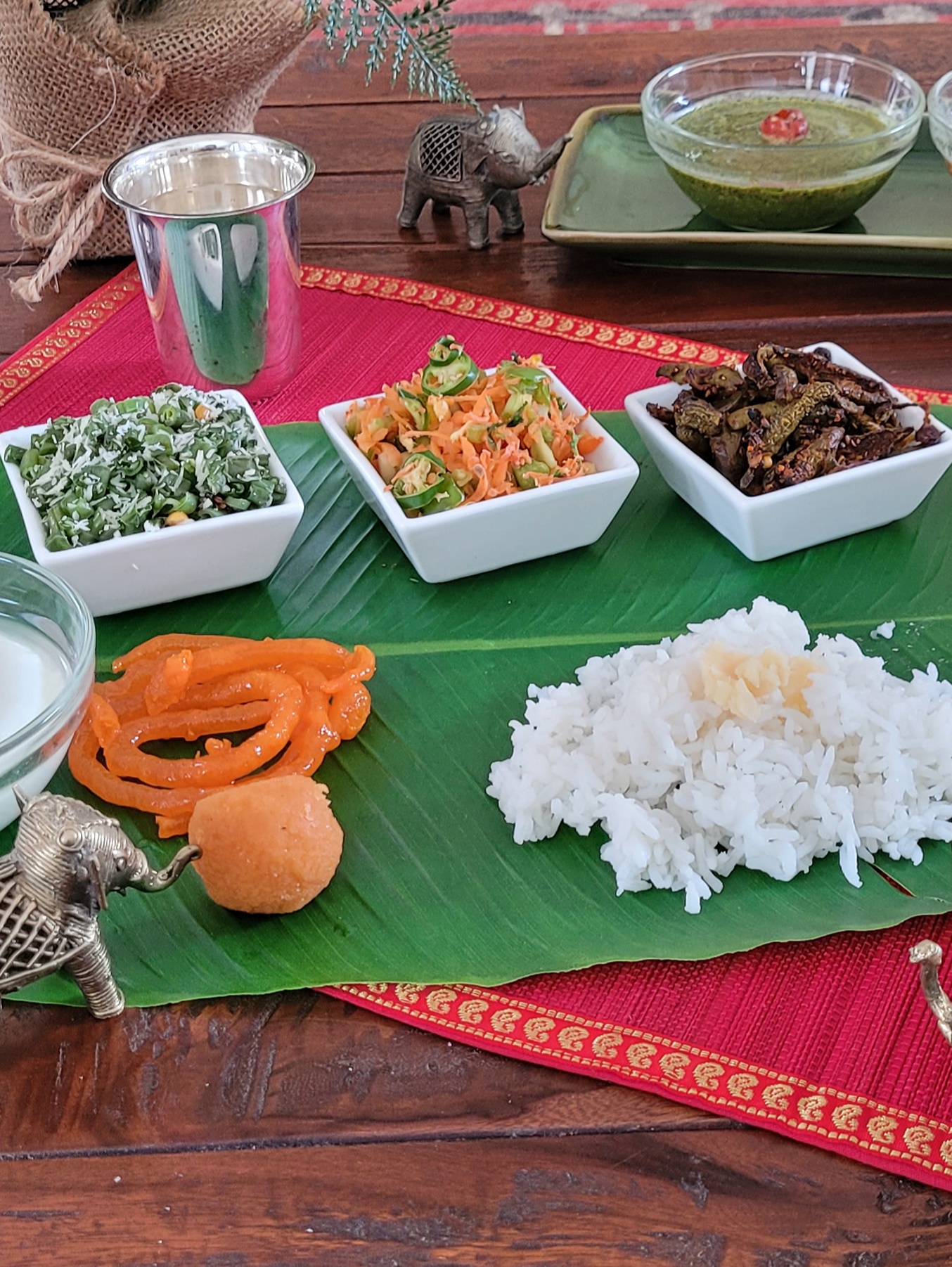 P.S. If you discount the cups on my frame, and serve it as done normally, right on the banana leaf, it is the perfect example of an eco friendly bio degradable vegetarian meal. Once the meal is done, the leaves were fed to the cows. If the cows will ever eat leaves without flavors again is another quesion😆…