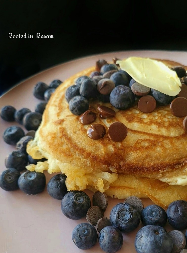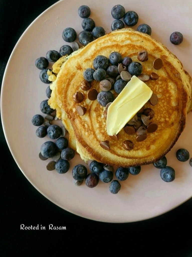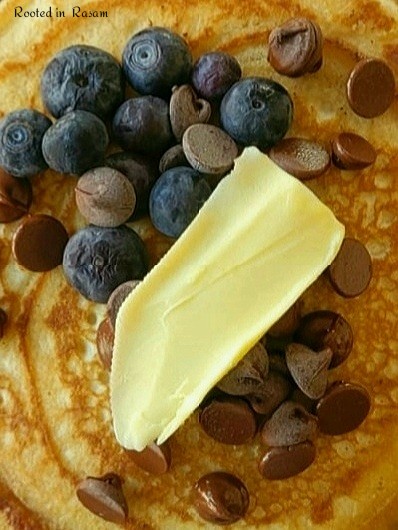 A simple pancake breakfast, topped with blueberries and chocolate chips, and a golden sliver of butter for drama !
