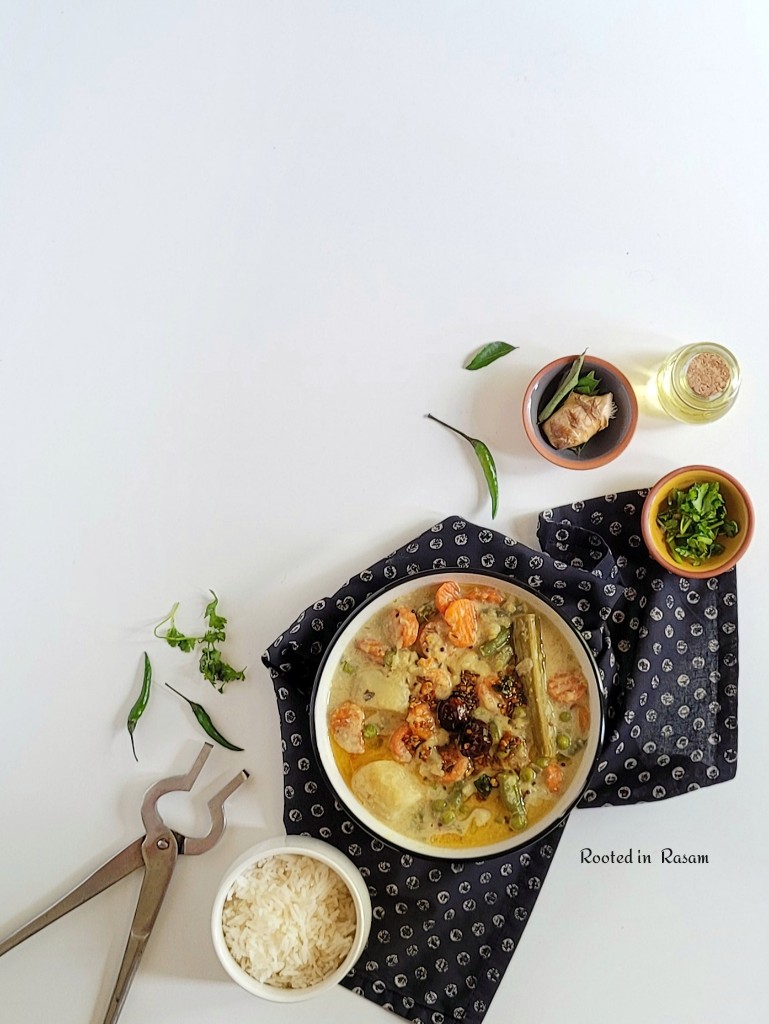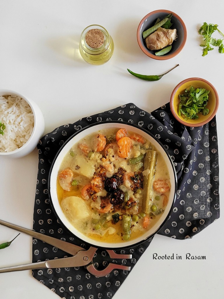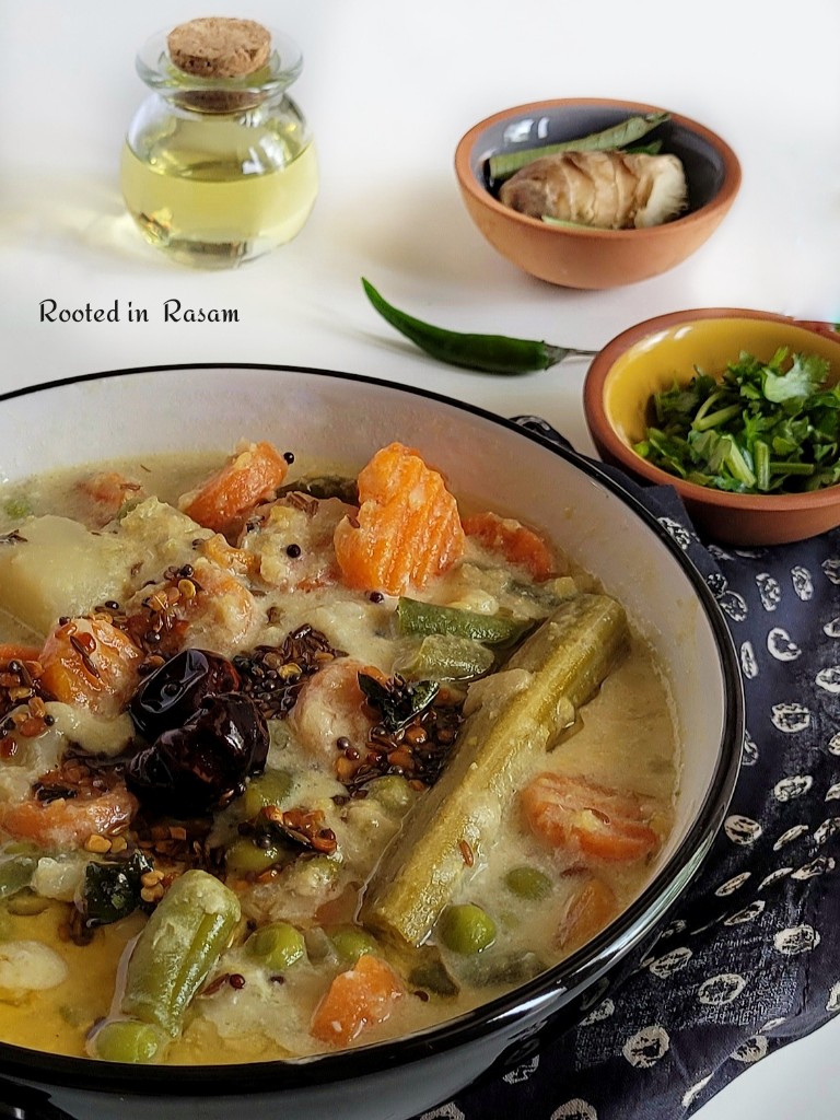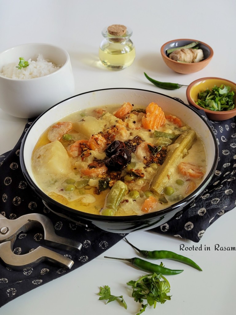 Flavored with Coconut and just a couple of spices, one Coconut is traditionally used to make 2 servings of Sodhi. So it is said that the status conscious mentally calculate the guest count at the wedding where this dish is served to determine the number of coconuts broken, and hence the spend on the meal !