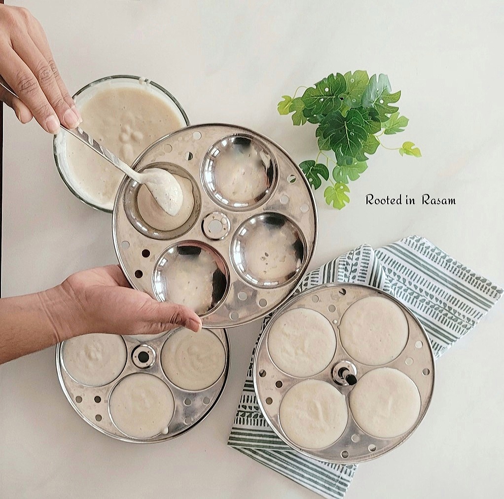 ⚪Grease idli plates with sesame oil and put a laddle of dough into each indentation