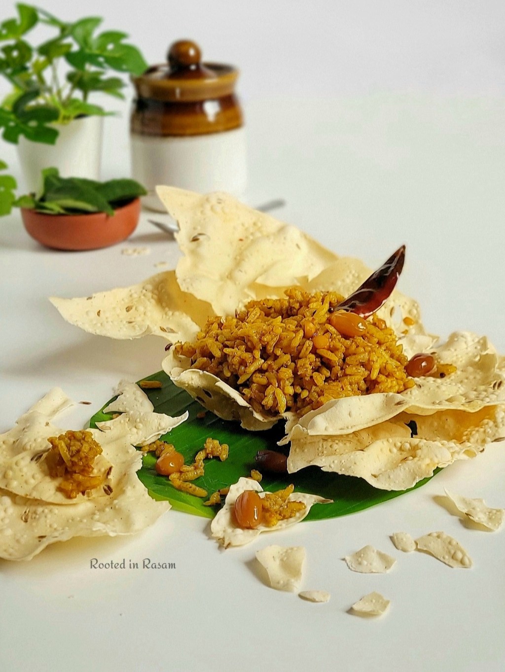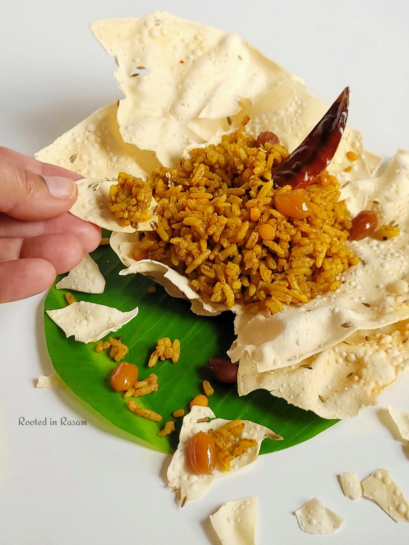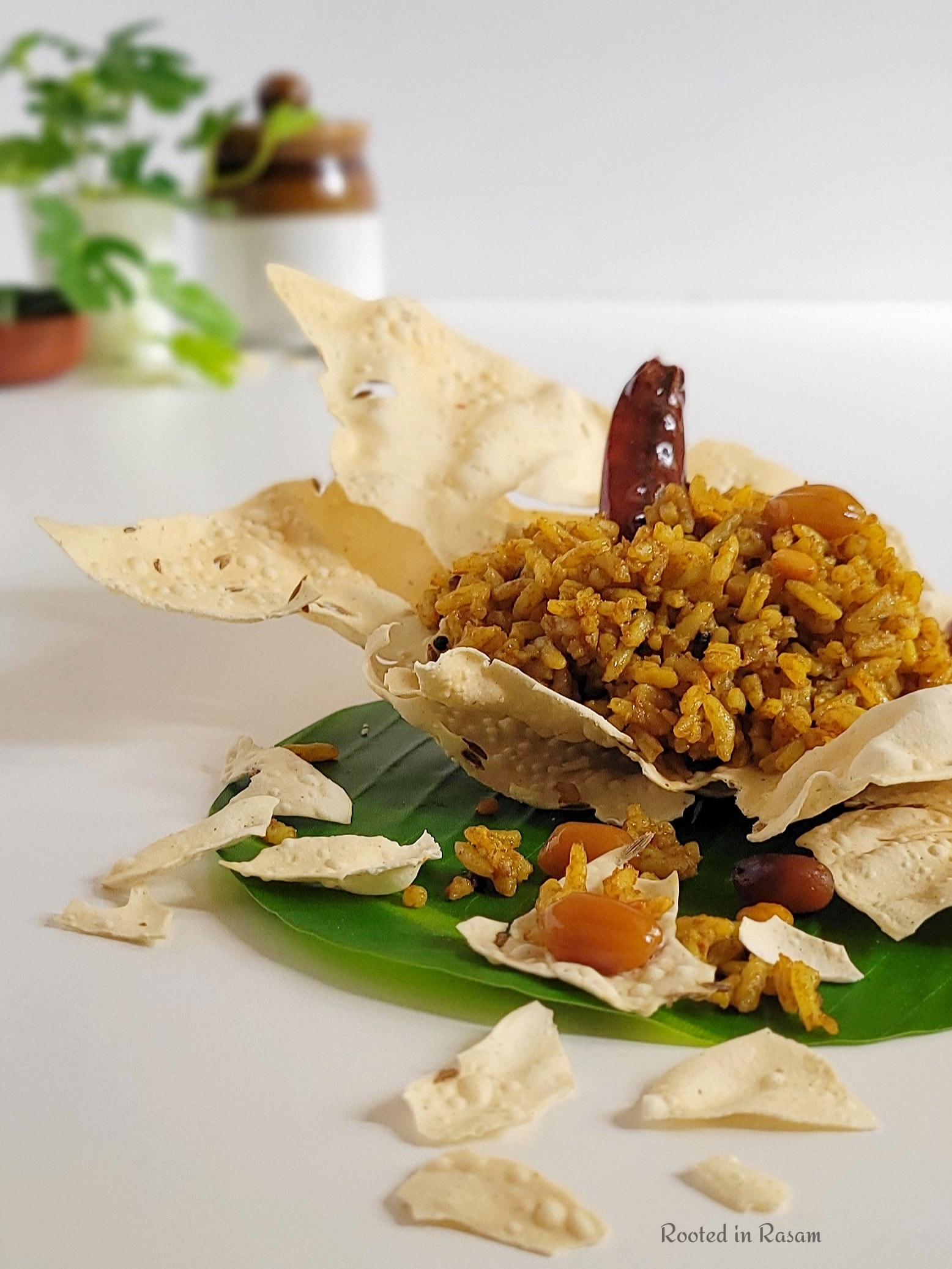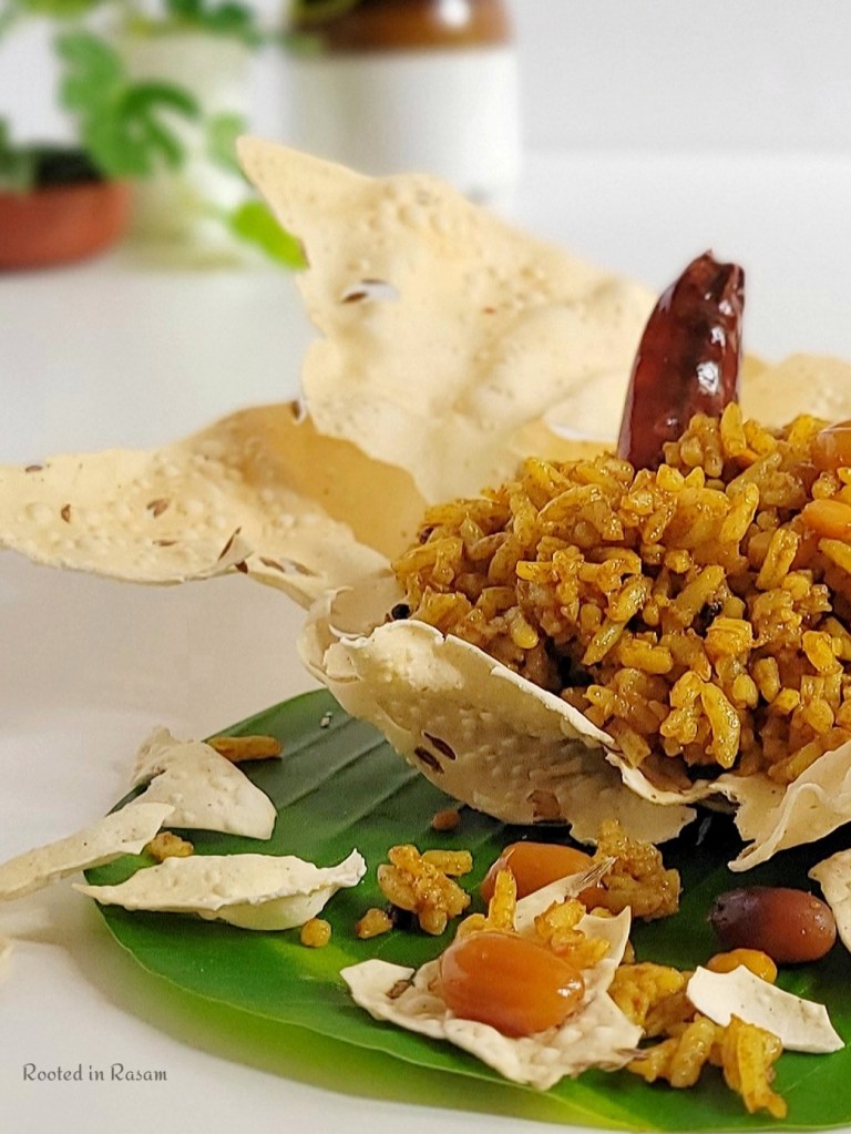 Featured here in an edible papad bowl, Tamarind rice or Puliodarai is rice tossed in a tangy spicy tamarind compote . This was a regular on the menu on picnics and train rides of the yesteryears, due to its versatility and ability to stay unspoilt for many hours in the South Indian heat!