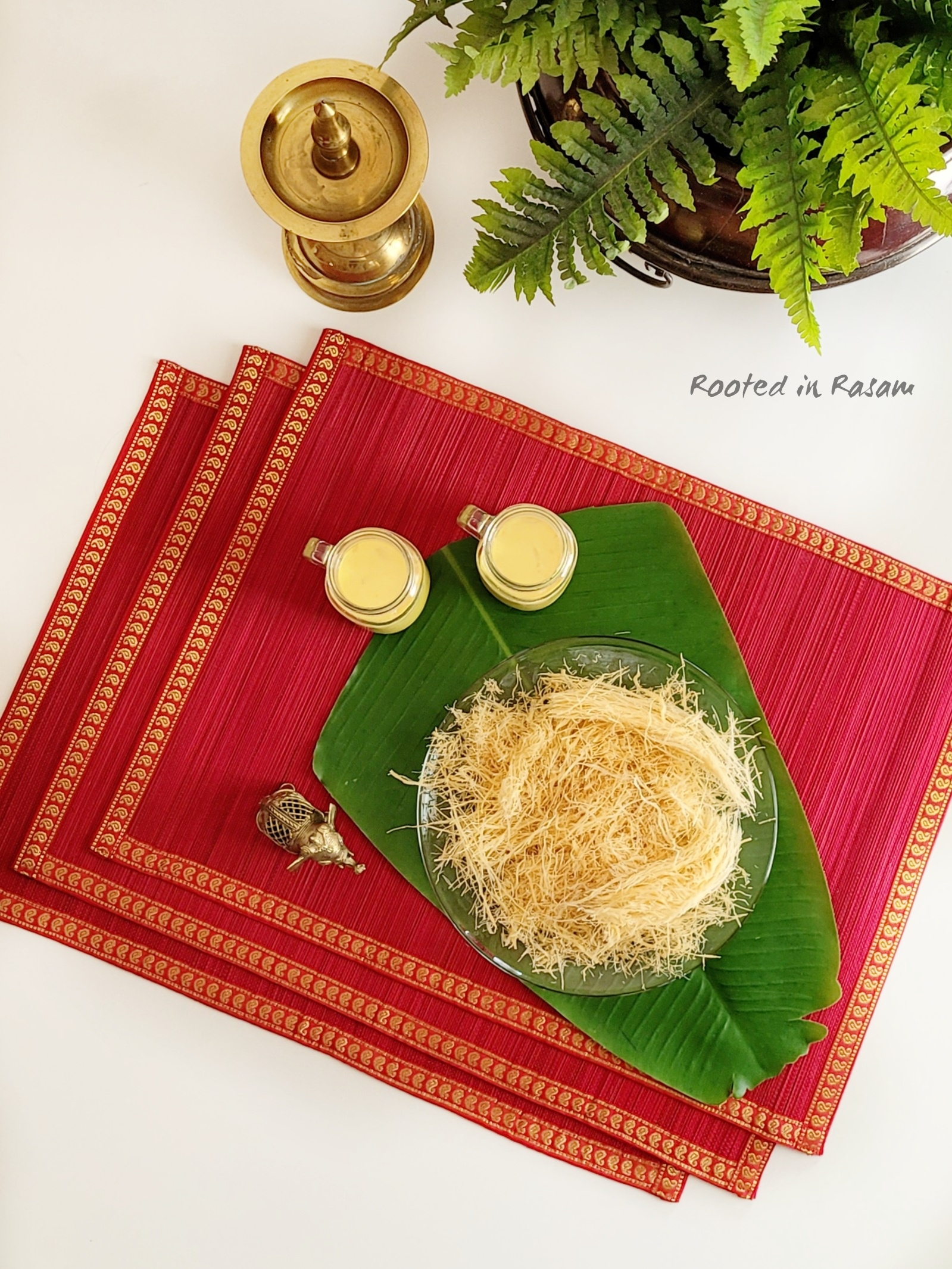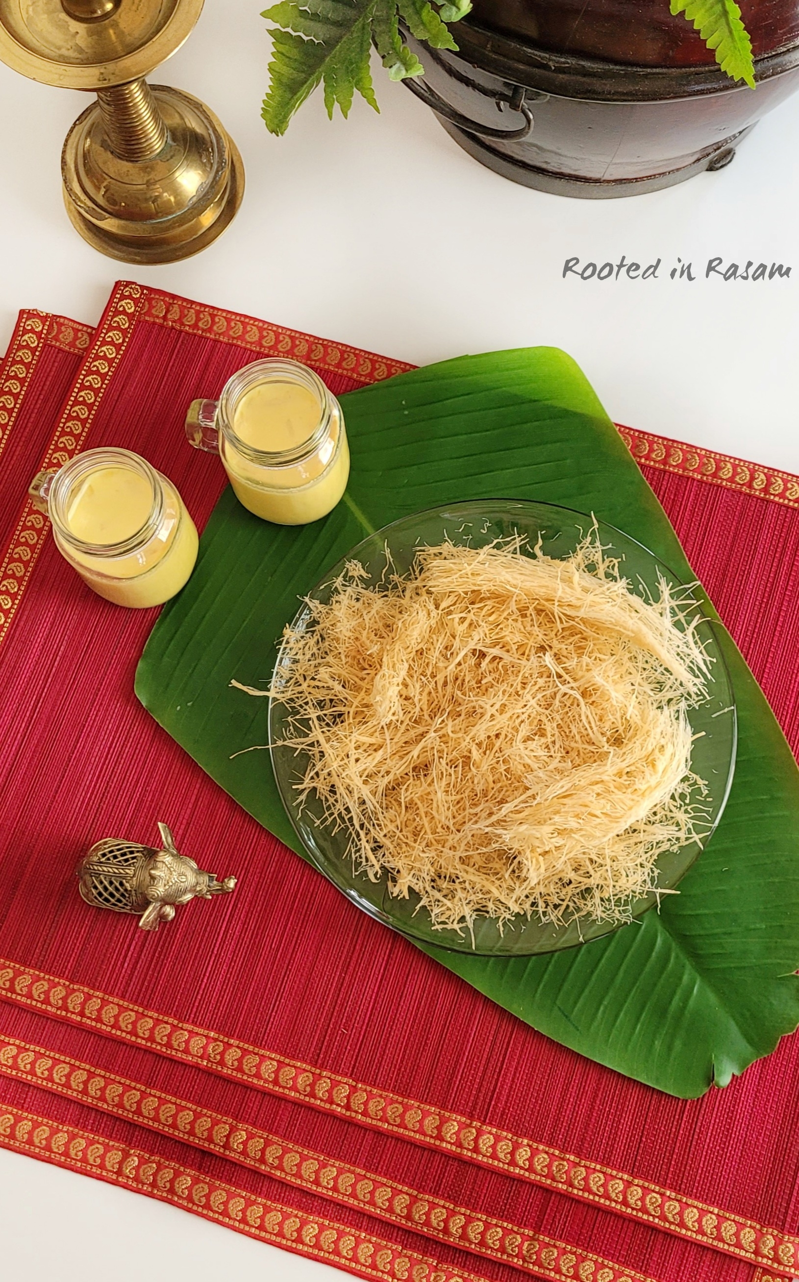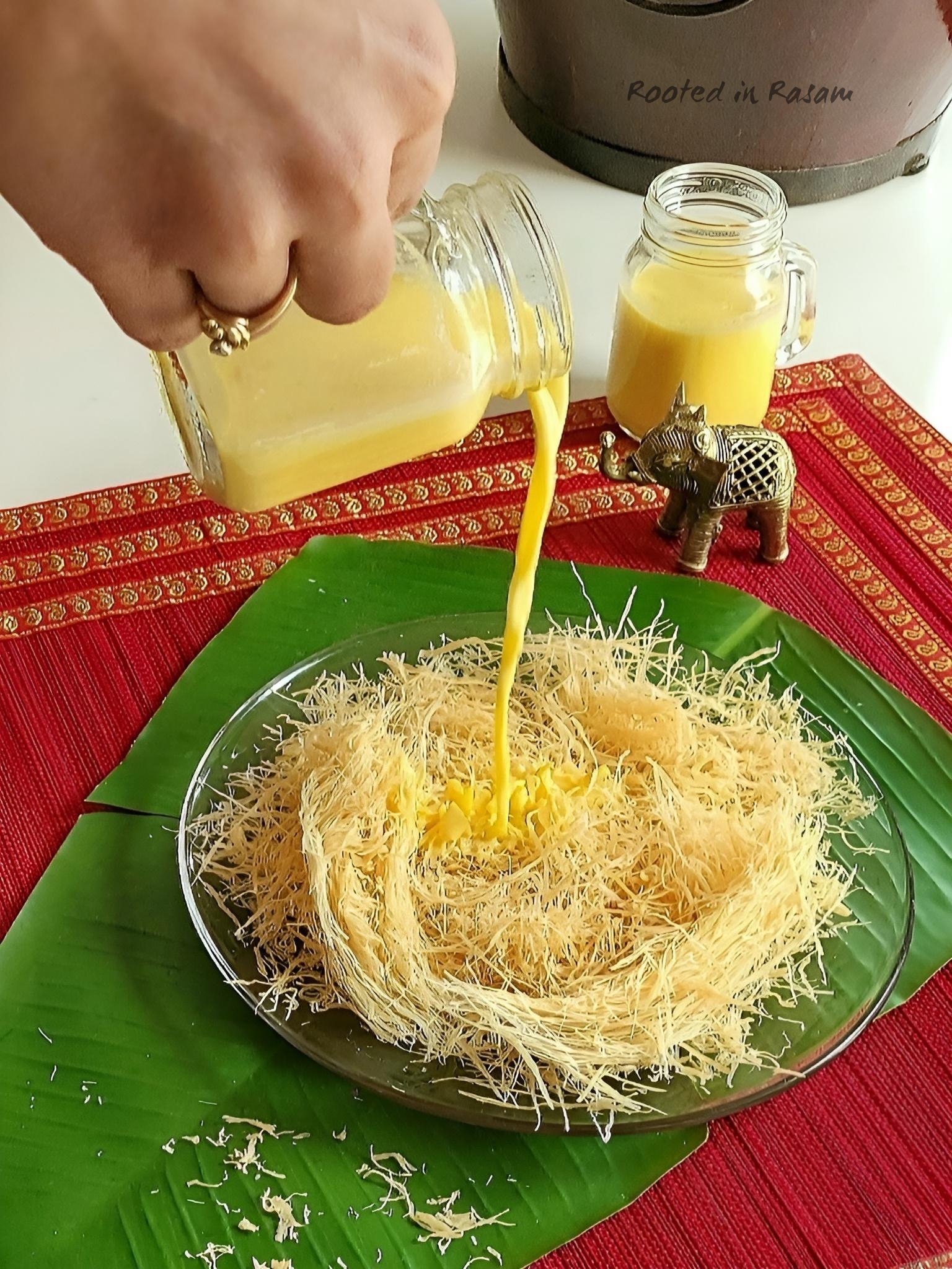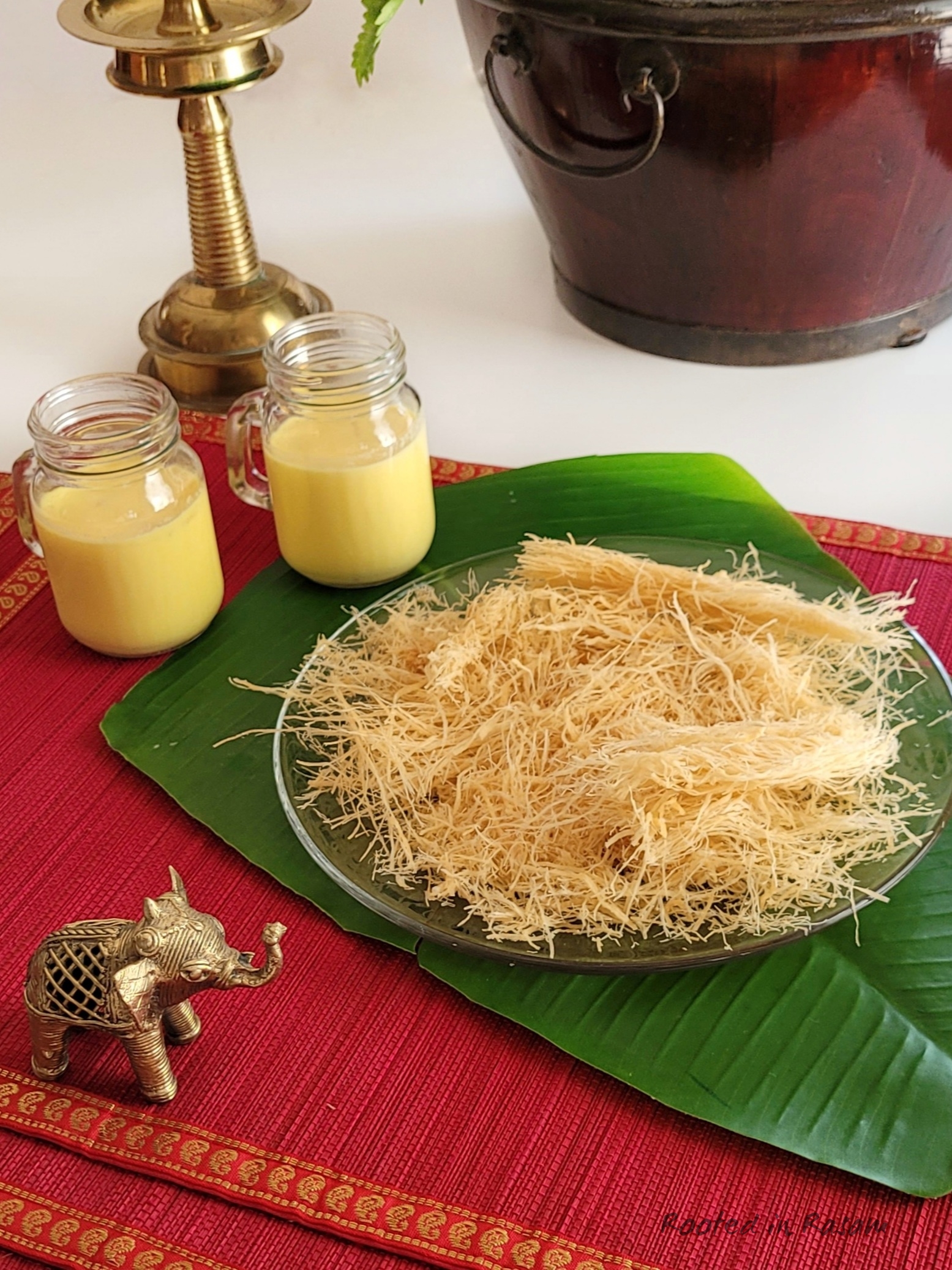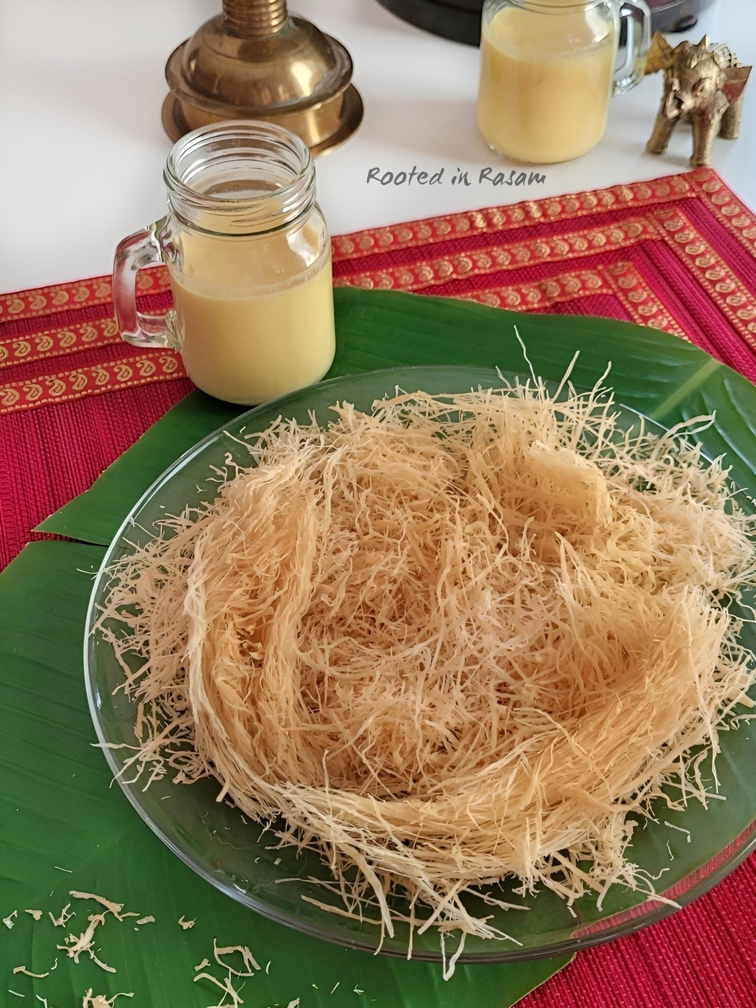Pheni – deep fried semolina, on which a rich warm almond milk is poured just before eating. This softens the pheni and makes it almost like a Kheer. Served traditionally at weddings, this is a family favorite and often on the menu.