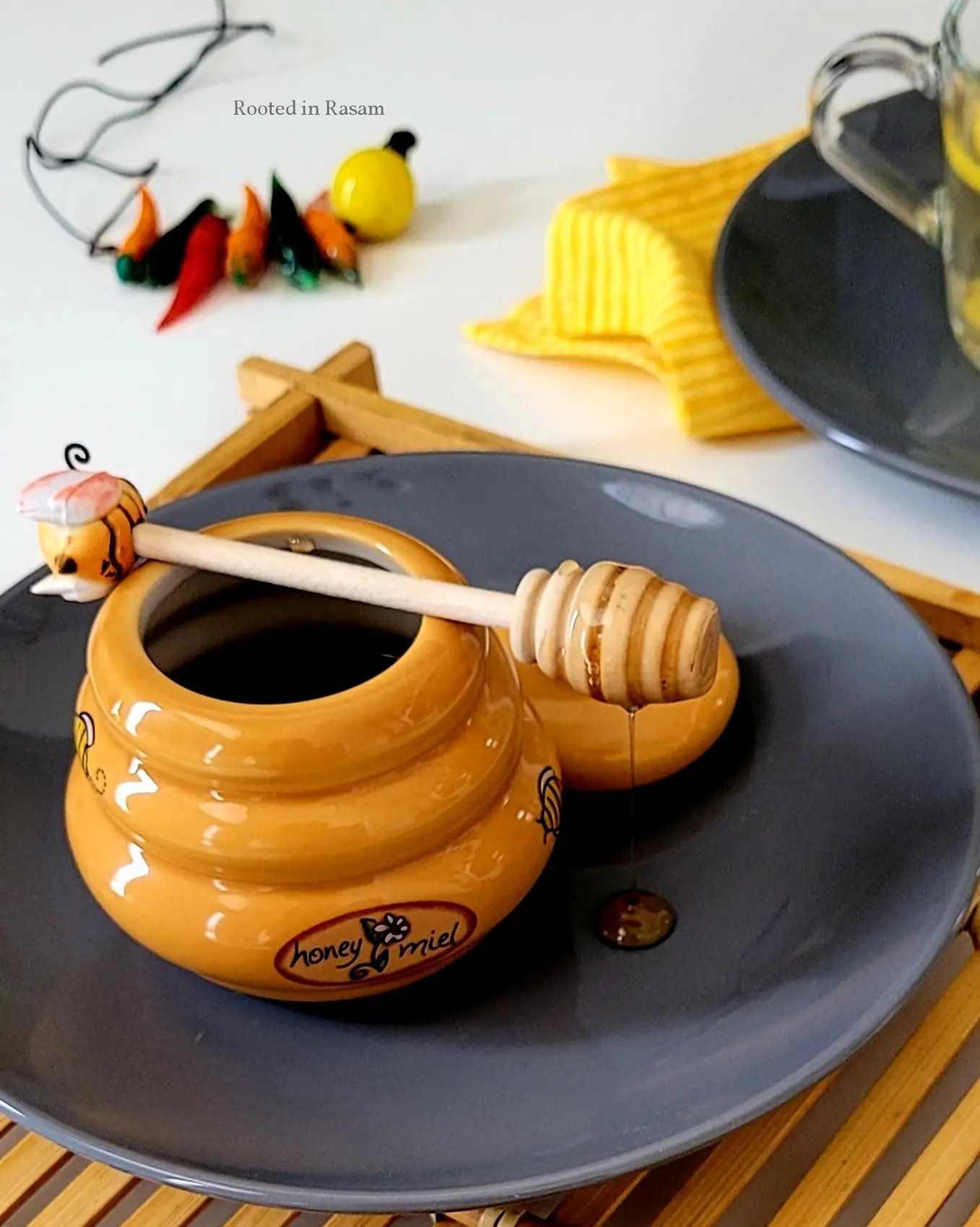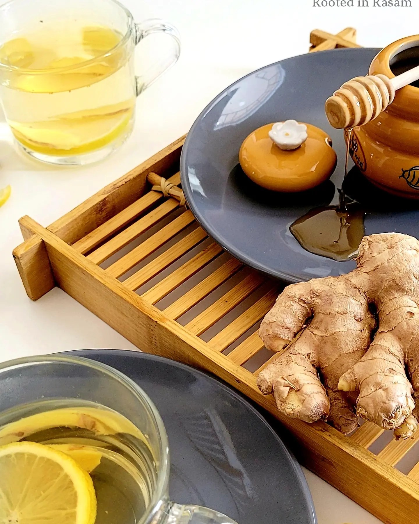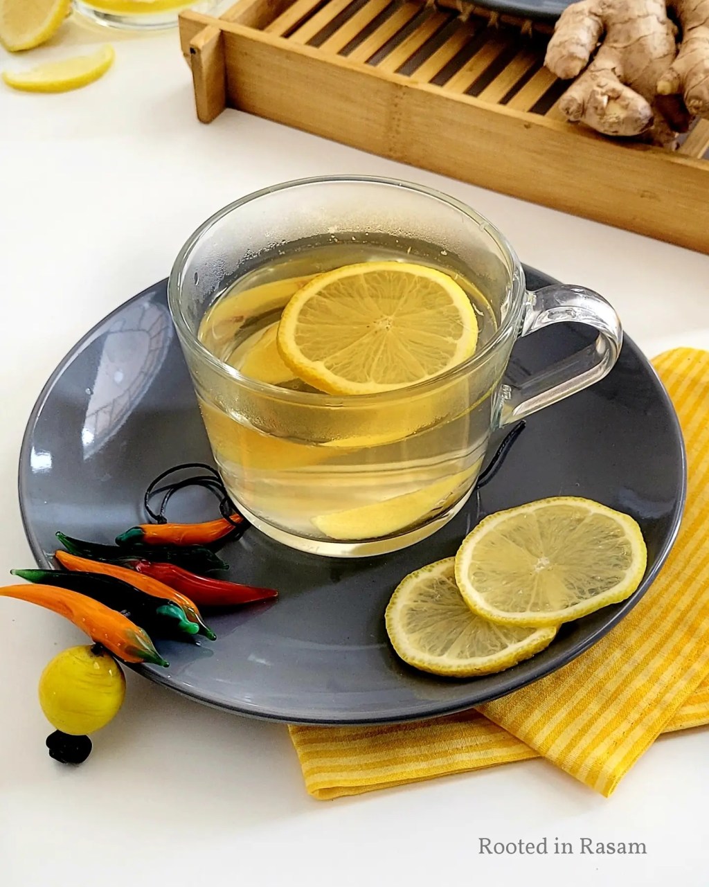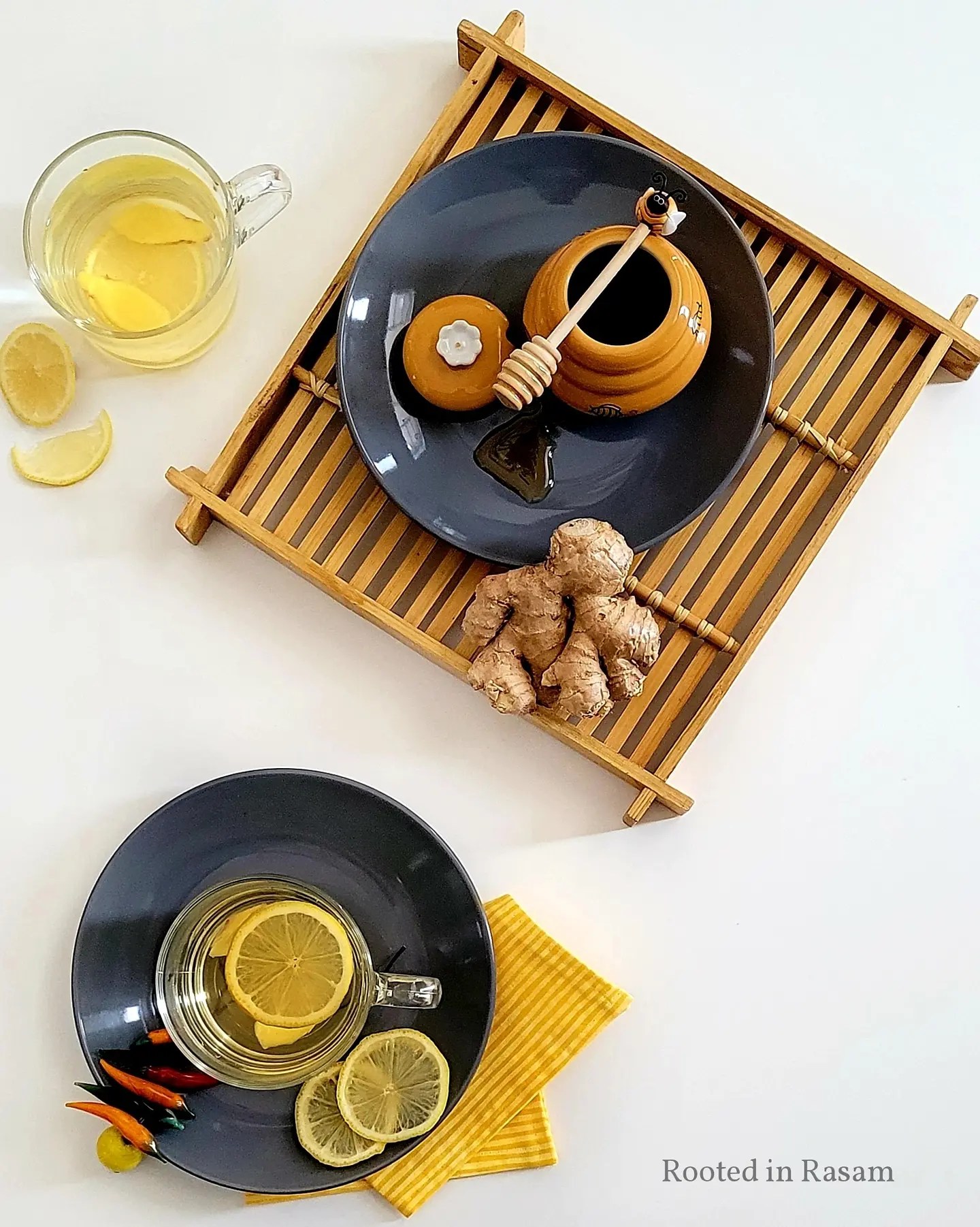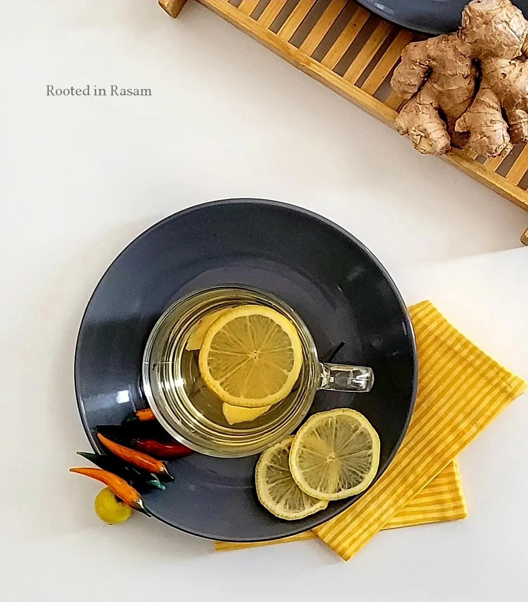 Warm water infused with a squeeze of lemon, a couple slices of ginger, sweetened with a dash of honey.