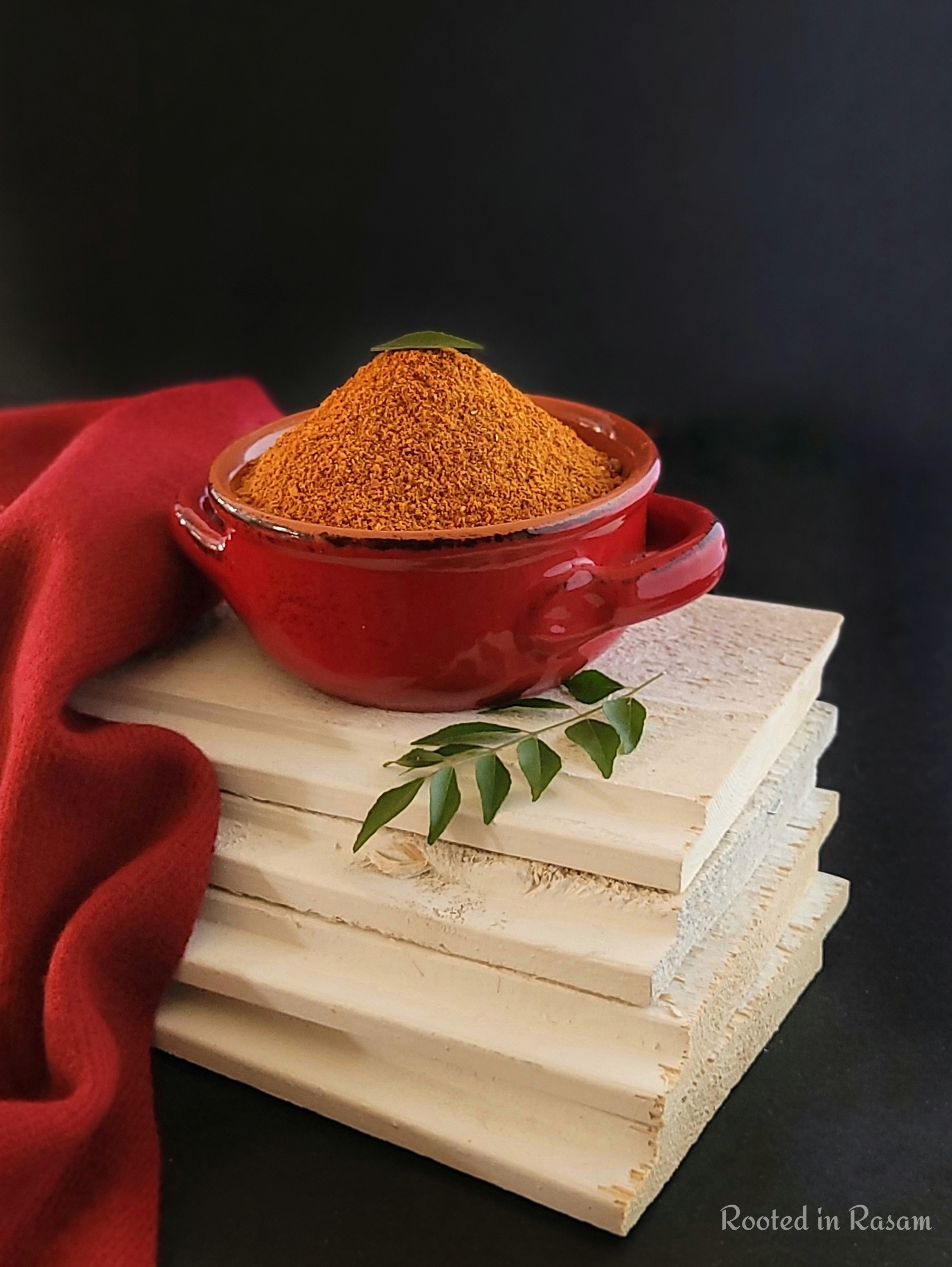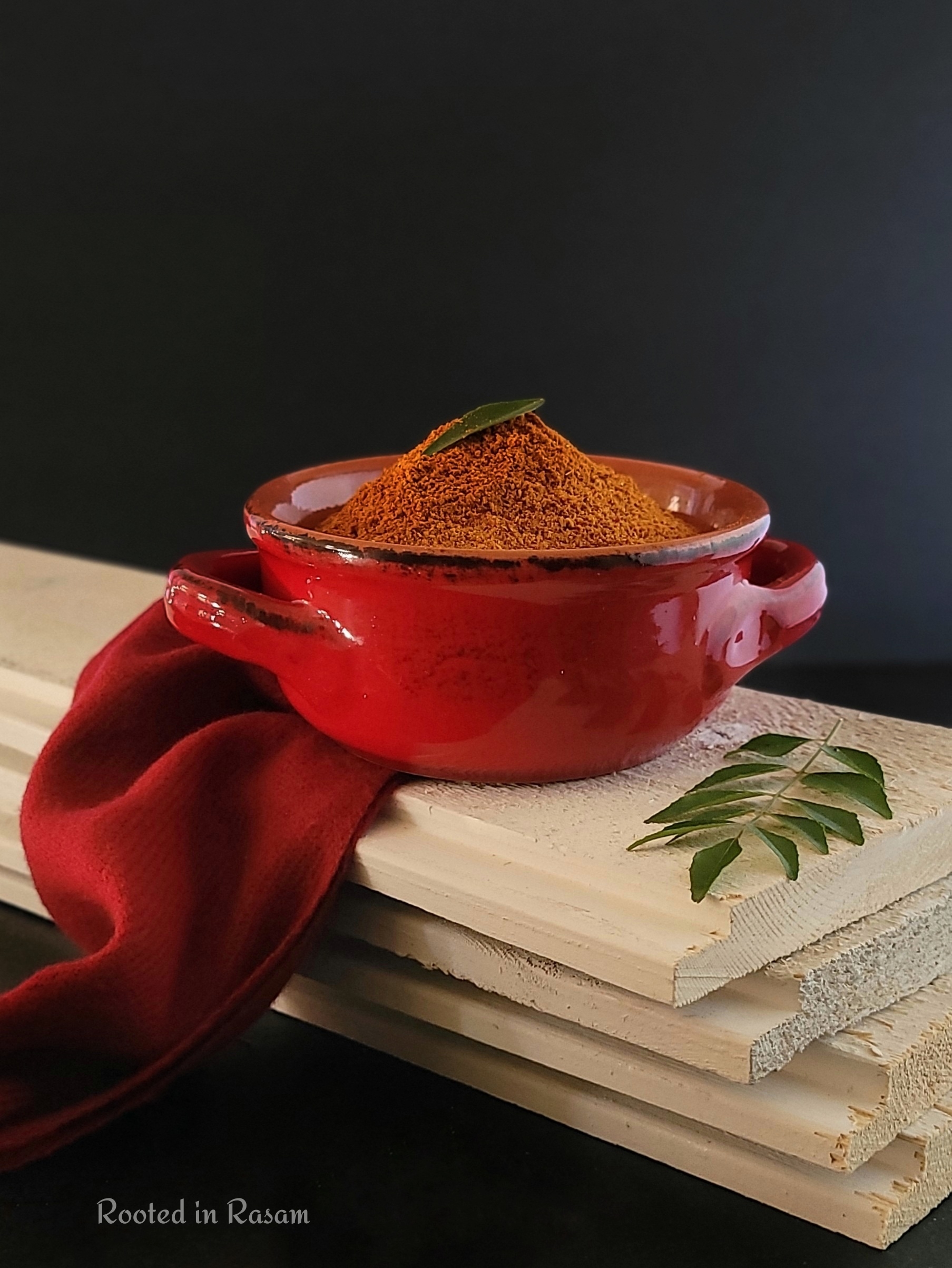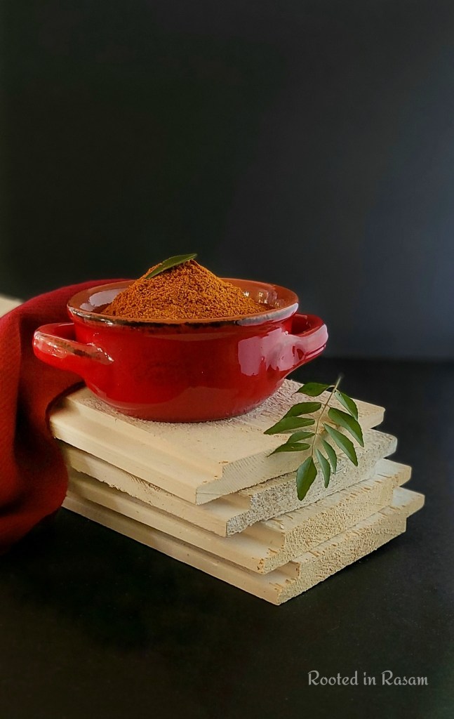 Featured is a blend of spices for a very TamBrahm soul food dish called Milagu Kuzhambu – a spicy pepper stew, very good for digestion and best eaten with rice and dry roasted papad