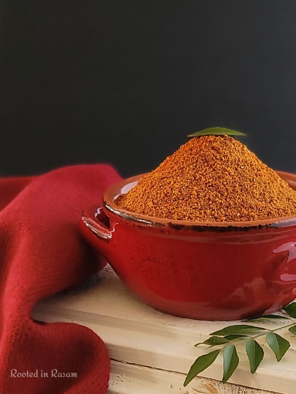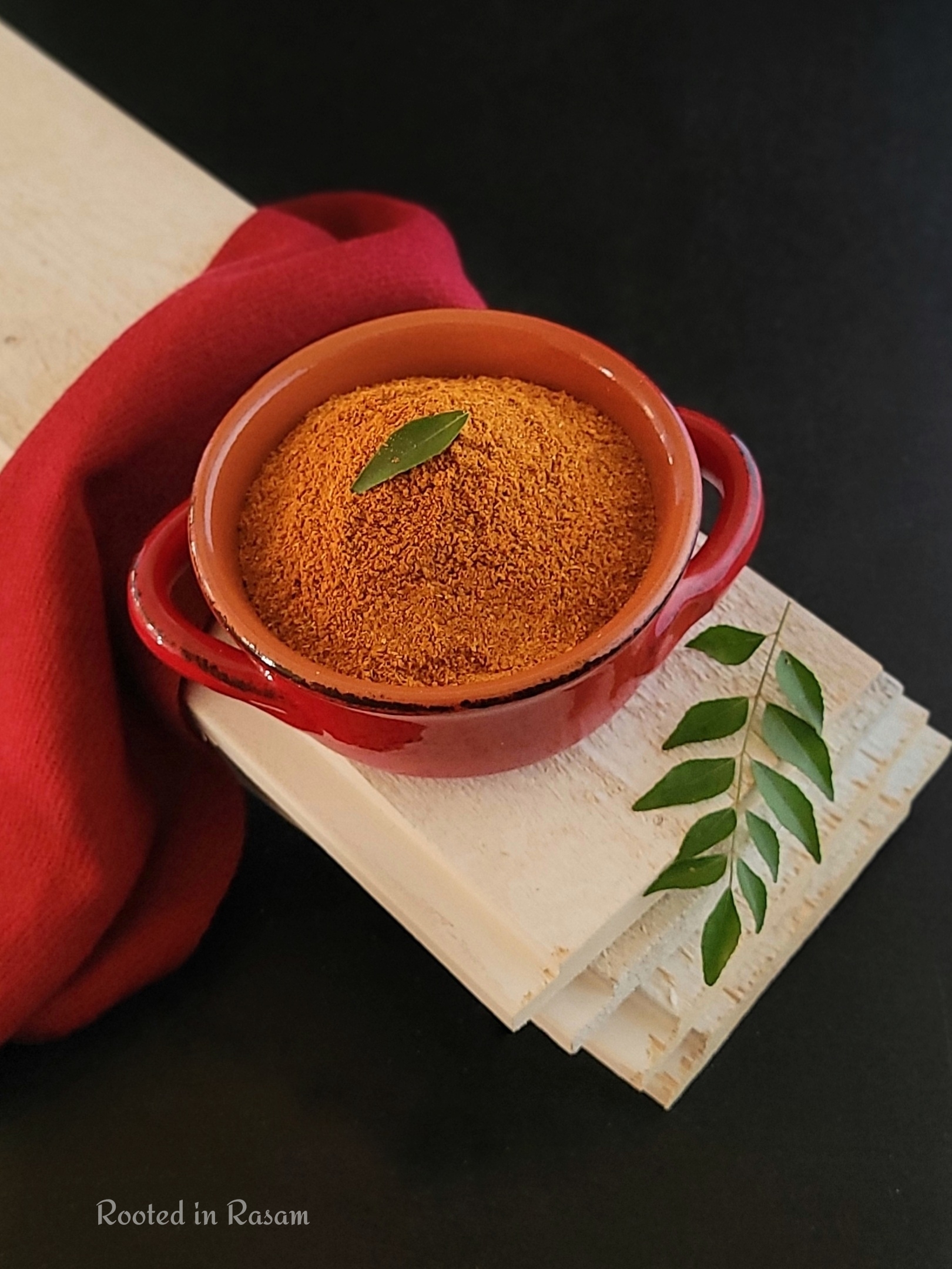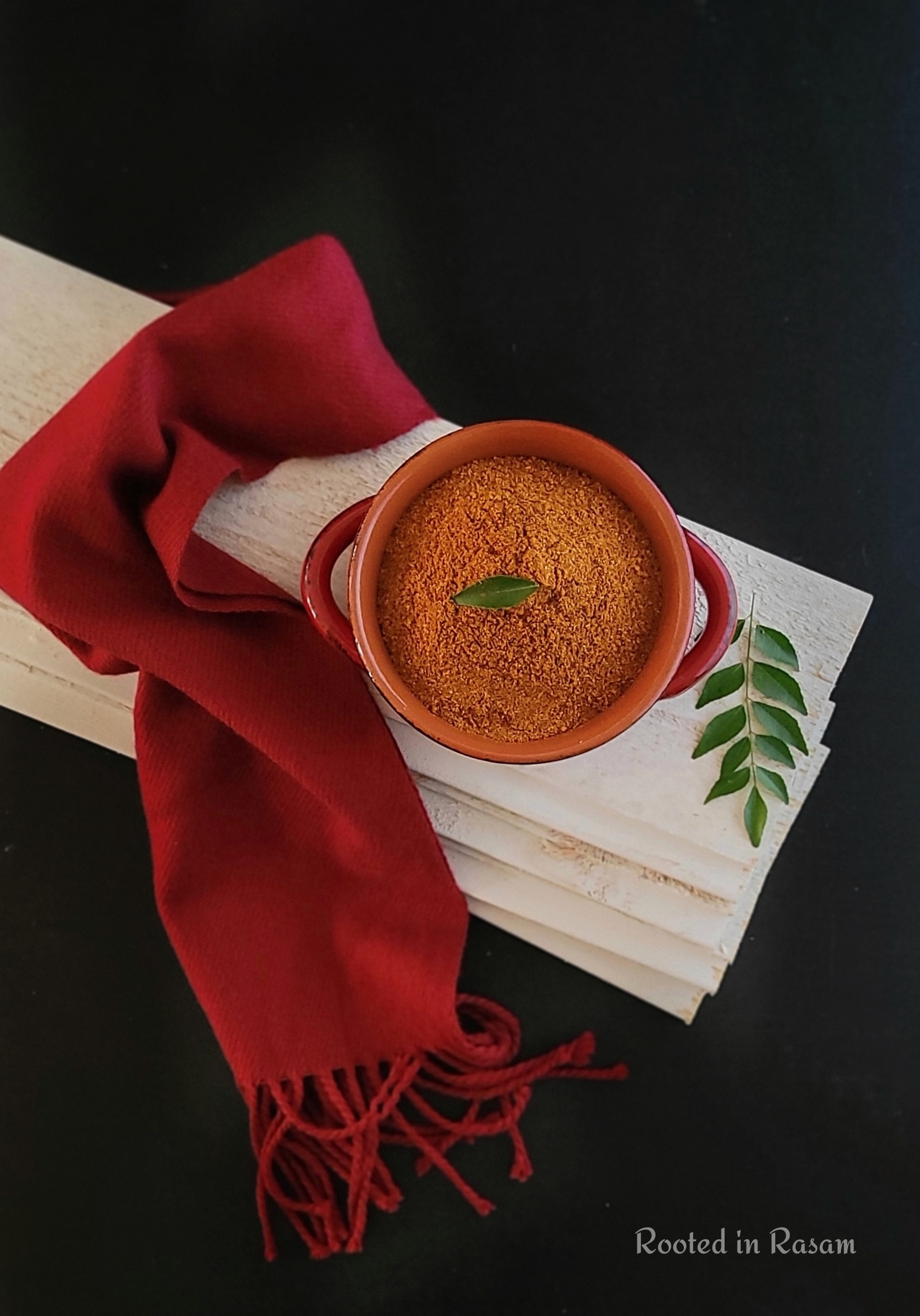 Featured is a blend of spices for a very TamBrahm soul food dish called Milagu Kuzhambu – a spicy pepper stew, very good for digestion and best eaten with rice and dry roasted papad