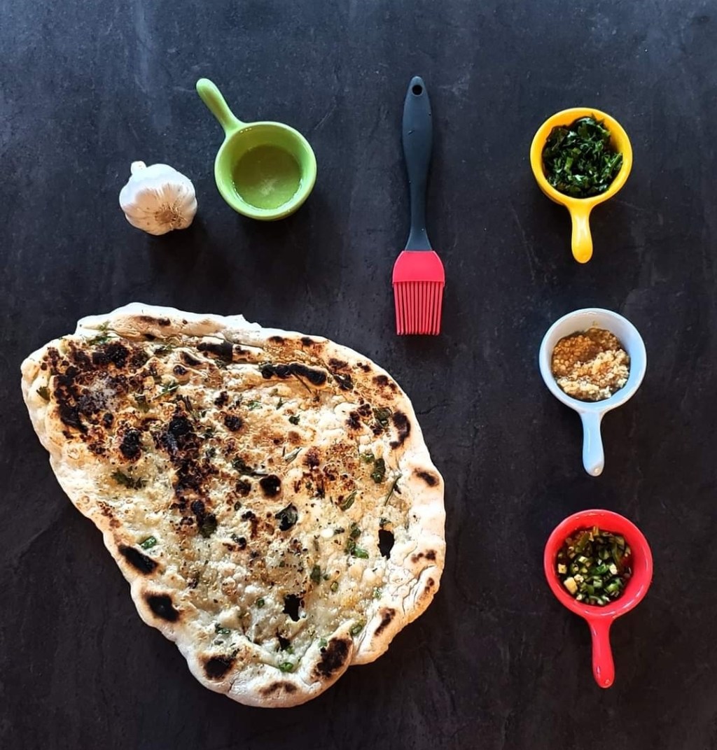 Sprinkle with garlic, chopped chillis and cilanto and pat down to adhere and partly embed in the naan.