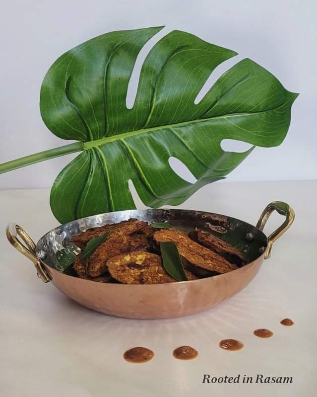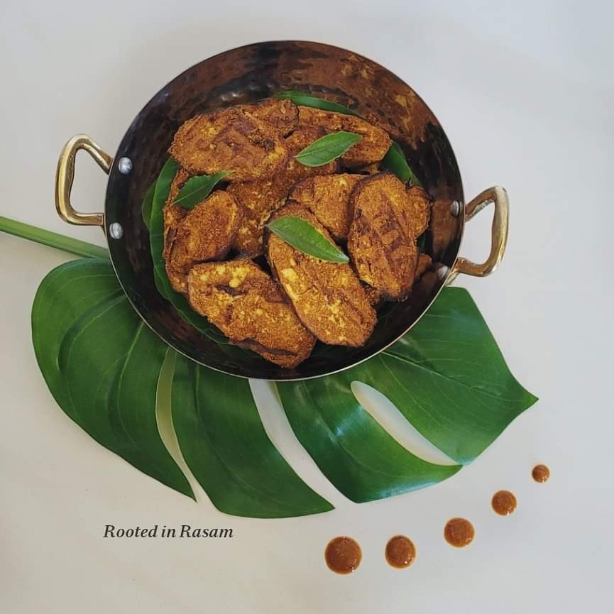 Peel and cut 3 medium plantains into 1/2 cm thick wedges. Keep soaked in water till use – otherwise they will get discolored.