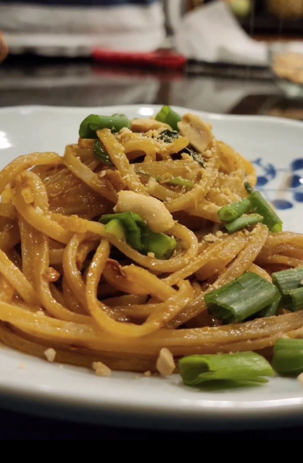 Garnish with crushed Peanuts, Spring Onions and a wedge of lime.